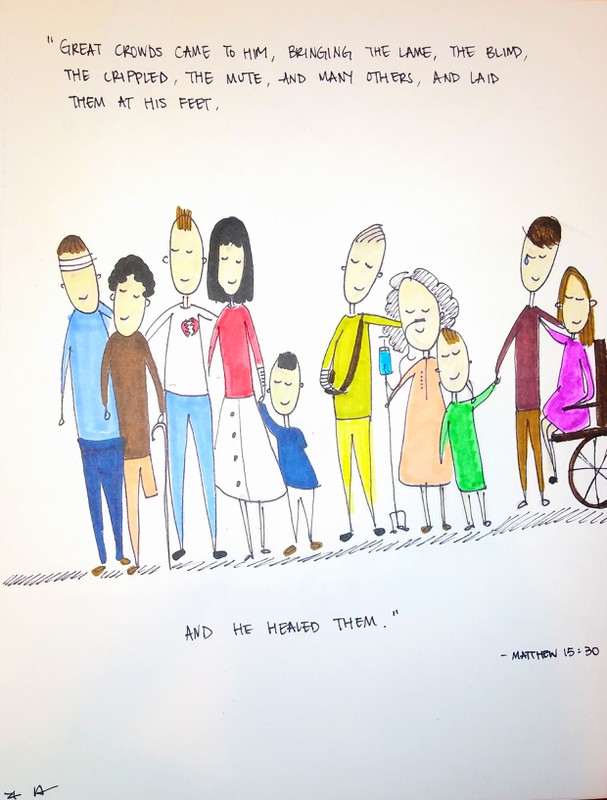 「有许多人到祂那里,带着瘸子、瞎子、哑吧、有残疾的,和好些别的病人,都放在祂脚前;祂就治好了他们。」(马太福音15:30)